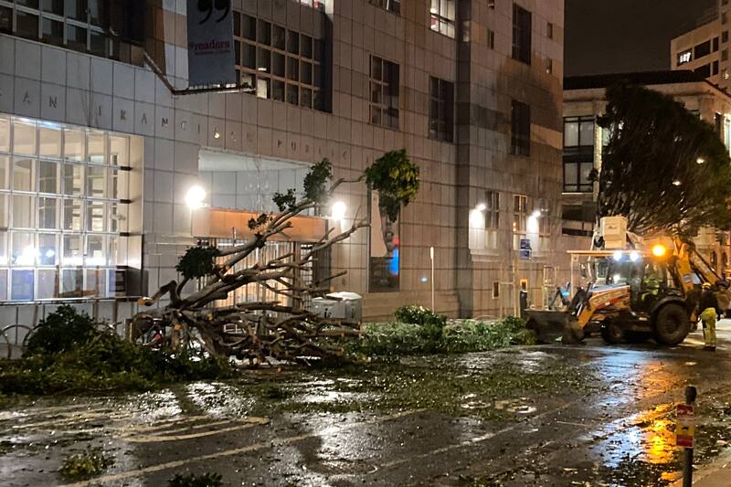Los fuertes vientos, con rachas de 136 km/h o más obligaron a cancelar más de 70 vuelos en el Aeropuerto Internacional de San Francisco y derribaron árboles y cableado eléctrico. Los bomberos rescataron a una familia tras la caída de un árbol sobre su auto y reportaron la caída de “grandes trozos de cristal” de la torre Fox Plaza, cerca del Centro Cívico, aunque no se registraron heridos. Es “muy posible” que los daños en el rascacielos estuvieran relacionados con el viento, tuiteó el departamento.