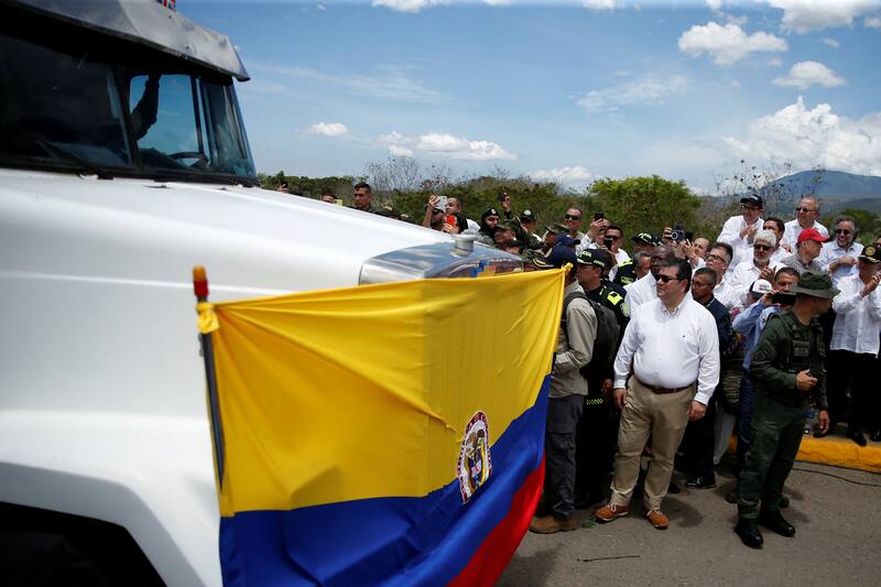 Un vehículo cargado de aluminio adornado con globos y la bandera de Venezuela y otro con medicamentos del lado colombiano cruzaron el lunes el puente internacional Simón Bolívar en un acto protocolario que selló el reinicio de las relaciones comerciales luego de siete años de tensiones políticas.