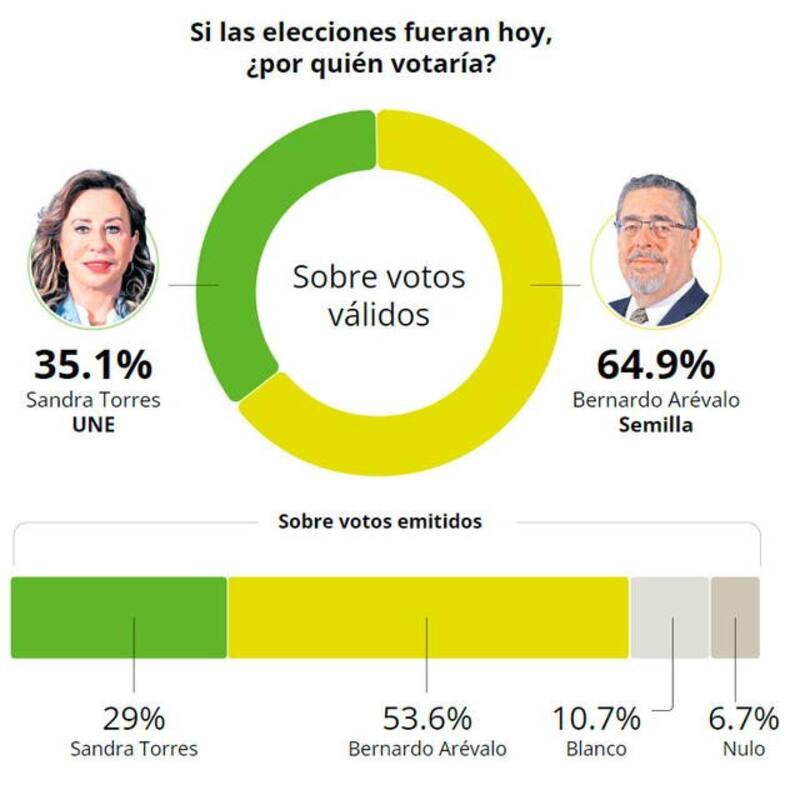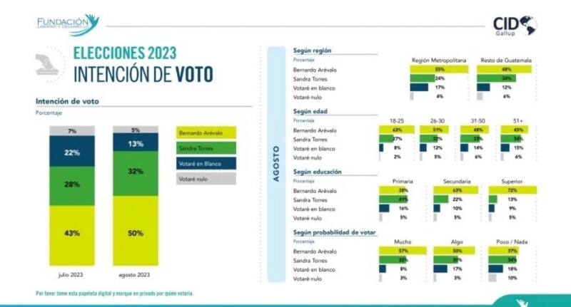 De cara al balotaje, las encuestas sugieren un posible giro en los resultados. Según un sondeo reciente de CID Gallup, fechado el 16 de agosto, Arévalo lleva la delantera con un 50%, en contraste con el 32% de Torres. Los votos en blanco y nulos representan un 13% y 5%, respectivamente. Si se consideran únicamente los votos válidos, Arévalo obtiene un 61% frente al 39% de Torres. Estos datos coinciden con la encuesta de Prodatos y Prensa Libre publicada el 17 de agosto, en la cual Arévalo supera a Torres por un margen de 30 puntos, 64,9% a 35,1%.