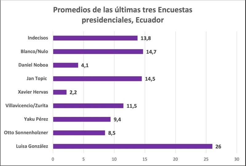 A pesar de tener la oportunidad, el presidente Lasso ha decidido no buscar la reelección, dada la fuerte erosión de su imagen durante sus primeros dos años de gestión. Ocho binomios compiten por la presidencia. El foco está en discernir si estos comicios reflejarán los resultados de 2021: si el correísmo, encabezado por Luisa González de Revolución Ciudadana y quien lidera las encuestas con un promedio del 26%, prevalecerá en una o dos vueltas, o si el “anticorreísmo” se impondrá. Cabe destacar que González es la única candidata femenina a la presidencia, se muestra firmemente en contra del aborto, ha recurrido al apoyo del expresidente Rafael Correa y aspira a capitalizar los logros del partido en las elecciones locales de febrero, donde se adjudicaron las alcaldías de Quito y Guayaquil.