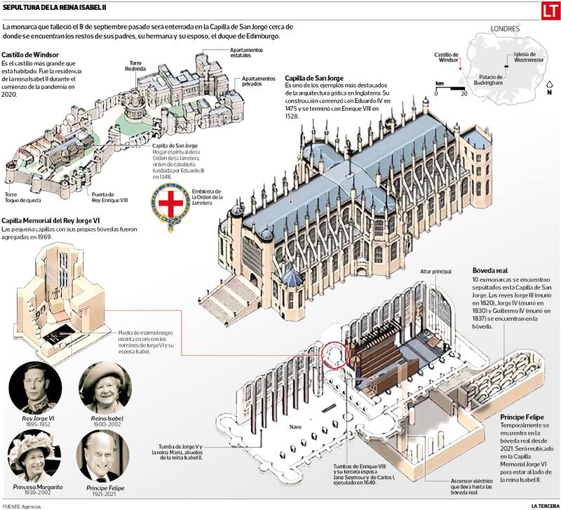 Las ceremonias públicas culminaron con el ataúd de la Reina, aún envuelto en el Estandarte Real, que se bajó por debajo del coro de la Capilla de San Jorge a la bóveda real, desde donde fue trasladada el lunes por la noche para yacer junto a su esposo, padres y hermana en el George VI Capilla Memorial.