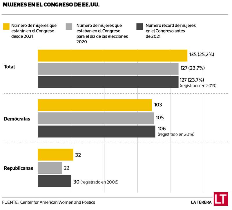 Por el lado del Partido Demócrata, 103 mujeres formarán parte del nuevo 117º Congreso. Sin embargo, esa cifra aún no supera el récord de 106 legisladoras tras los comicios de 2018.
