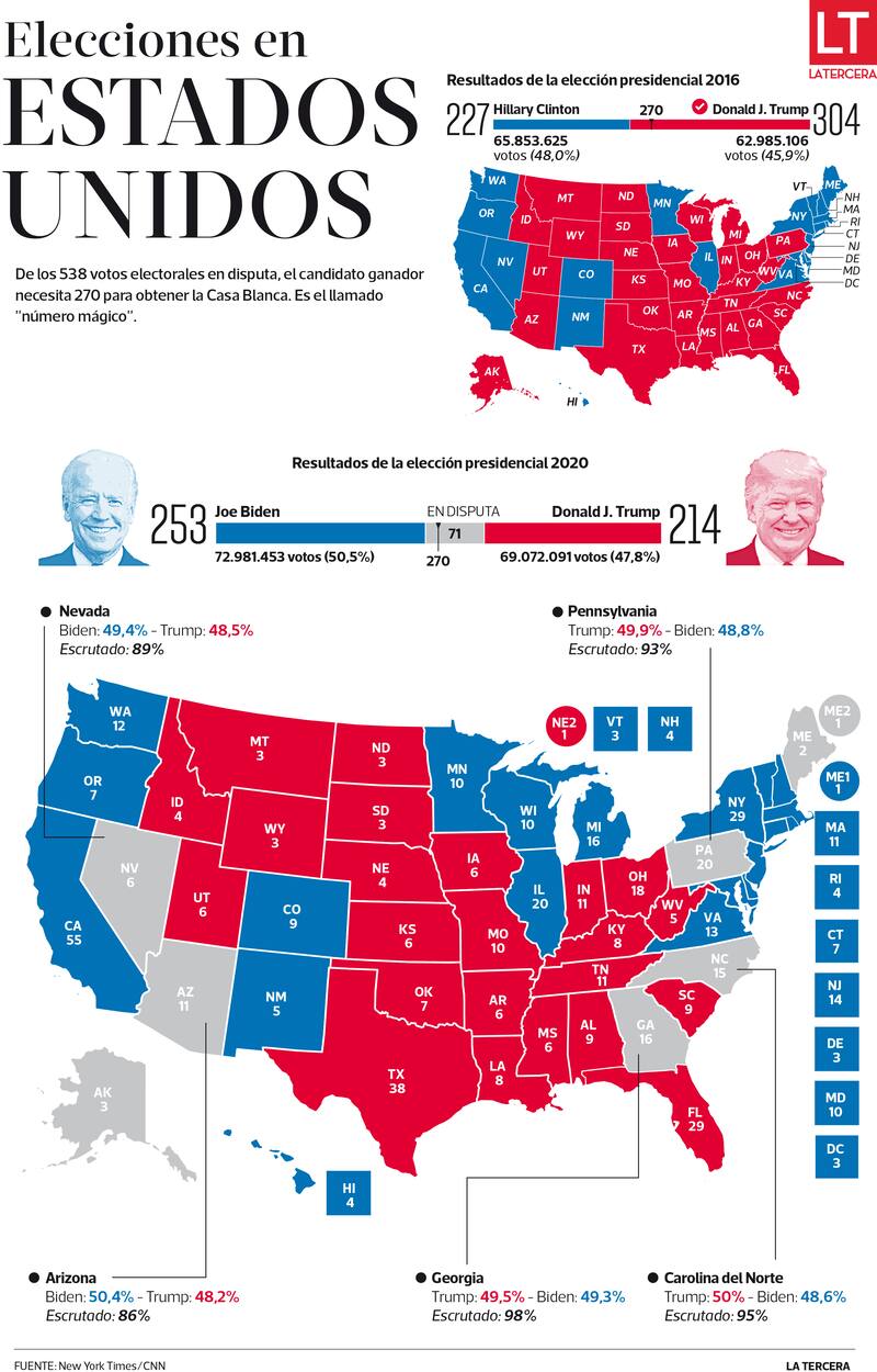 Con sus escrutinios aún en curso, Arizona, Nevada, Georgia, Pennsylvania y Carolina del Norte mantenían aún en la incertidumbre el resultado de la disputa entre Trump y Biden. En varios de esos estados la diferencia es inferior a dos puntos.