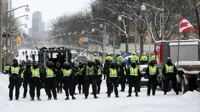 Cientos de policías recorrieron este sábado las calles de la asediada capital de Canadá, donde retiraron y arrestaron a manifestantes, remolcaron sus camiones y finalmente retomaron el control de las calles frente a los edificios del Parlamento.