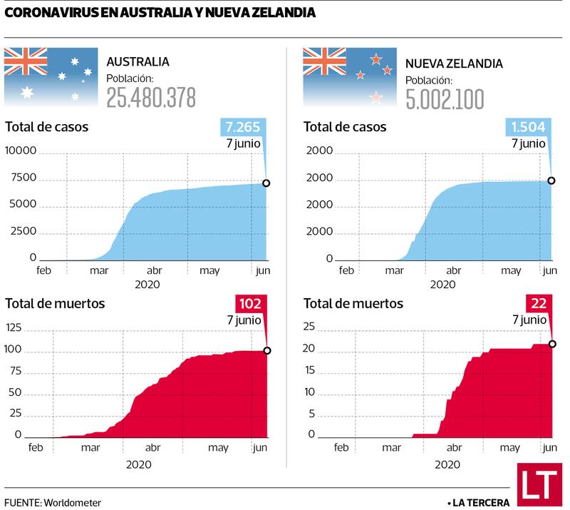 Nueva Zelandia se declaró libre de coronavirus gracias a una cuarentena temprana y estricta, mientras que Australia, que tardó más en reaccionar y optó por evitar un confinamiento obligatorio, también ha observado resultados positivos.