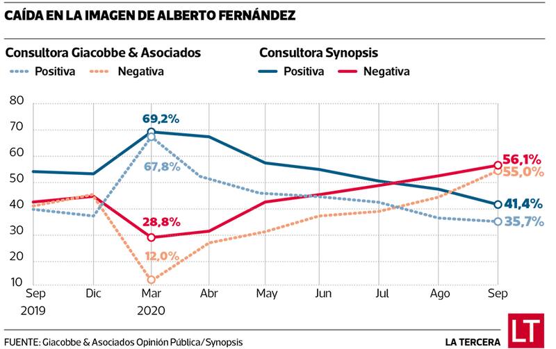 La consultora argentina Synopsis también registra esta fuerte caída de la imagen del Presidente transandino, con un 69,2% de apoyo favorable a fines de marzo y un 41,4% a la fecha. Según Lucas Romero, quien dirige Synopsis, en este fenómeno inciden tres factores: “Uno es el económico. Venimos con una economía en recesión desde mediados de 2018, y el principal mandato que recogió Alberto Fernández era el de poner en marcha la economía. Ese mandato hoy sigue incumplido y algunas decisiones en esta última etapa están generando más incertidumbre”, explica a La Tercera.