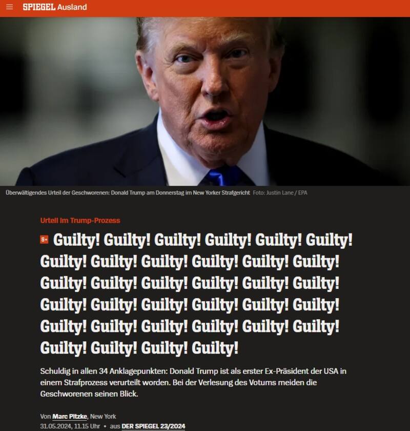 El Der Spiegel de Alemania tituló usando 34 veces la palabra “culpable”, por cada uno de los 34 delitos graves por los que fue condenado.