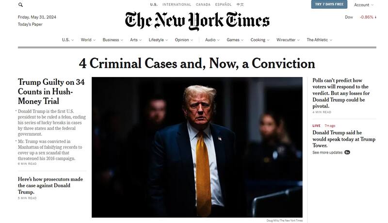 El New York Times tituló con “4 causas penales, y ahora, una condena” y “Trump culpable en 34 cargos”