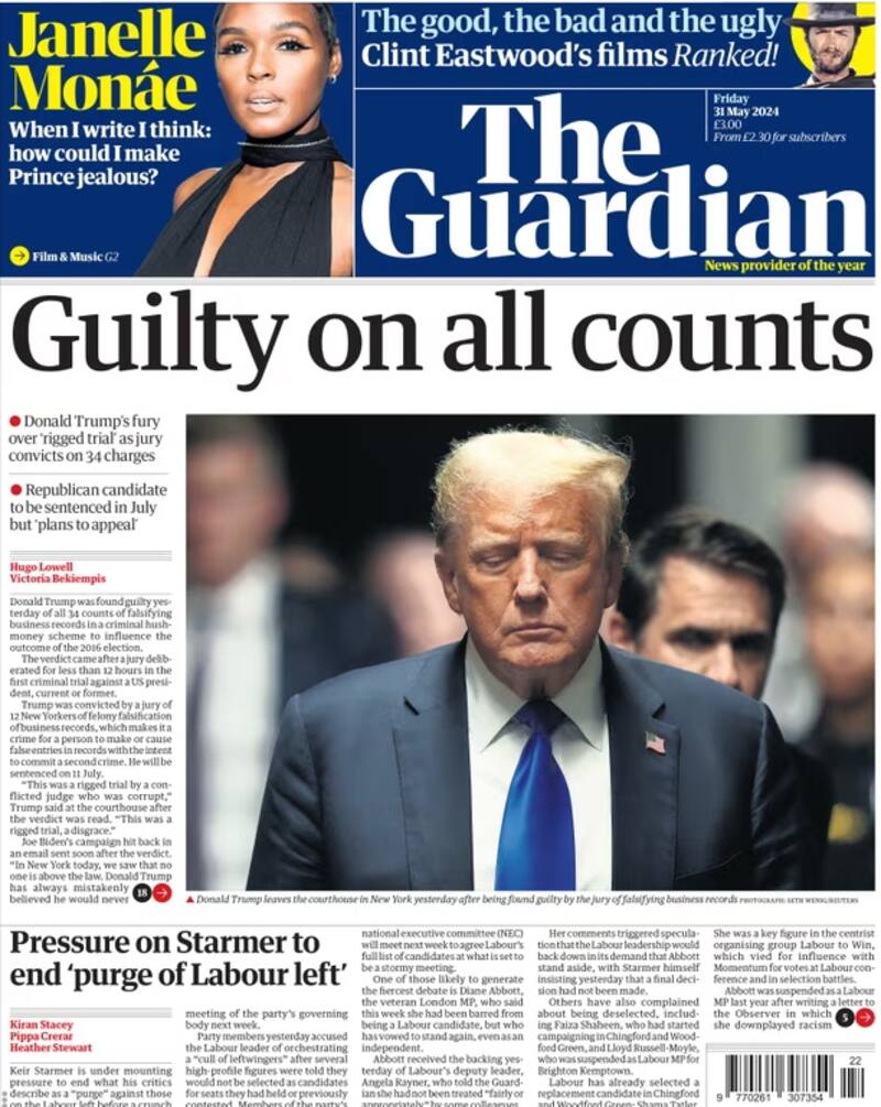 La versión impresa por otra parte, tituló con “Culpable: jurado condena a Trump en los 34 cargos”