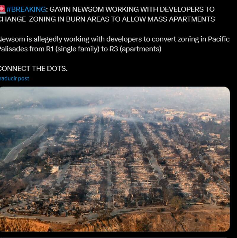 “Newsom está trabajando con desarrolladores para cambiar la zonificación en las áreas quemadas para permitir la construcción de apartamentos masivos”. Esta misma hipótesis circuló con millones de seguidores. “Se dice que Newsom está trabajando con desarrolladores para convertir la zonificación en Pacific Palisades de R1 (unifamiliares) a R3 (apartamentos)”, agregó el usuario en la red social.