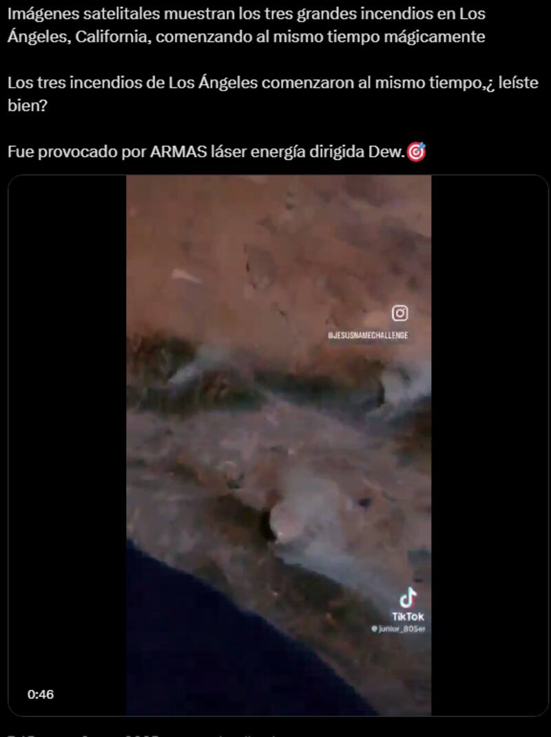 Fue a través de la red social X, que un video de imágenes satelitales se difundió mostrando como, de forma casi simultánea, aparecen tres humaredas que avanzan hasta cubrir casi por completo el espacio que ocupan. Su viralización ocurrió durante el 9 de enero con un mensaje que menciona que “imágenes satelitales muestran los tres grandes incendios en Los Ángeles, California, comenzando al mismo tiempo mágicamente”.