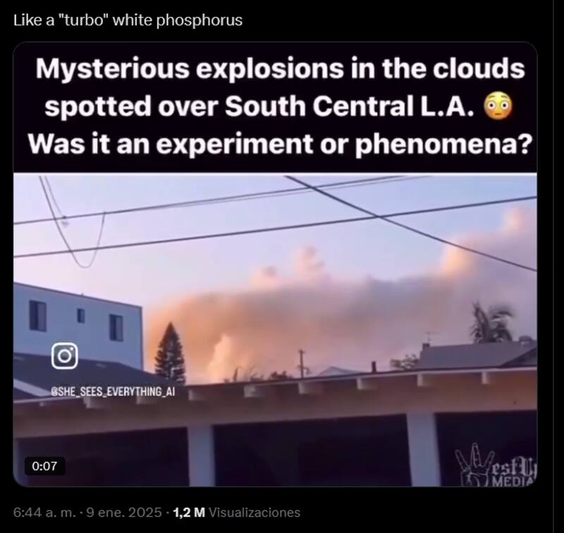 Otro vídeo que circula en redes sociales en uno que muestra en el cielo numerosas explosiones con un texto redactado en inglés que alerta de “misteriosas explosiones en el cielo avistadas en el centro sur de Los Ángeles”. Esta filmación es antigua y no guarda relación con los incendios que se desarrollan desde el 7 de enero de 2025 en California.