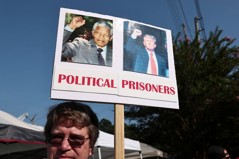 El jueves por la mañana, muchos partidarios de Trump se manifestaron frente a la puerta principal de la cárcel del condado de Fulton. Muchos portaban grandes banderas de Trump y vestían camisetas y gorras de MAGA, deambulando entre una multitud de medios. Los cánticos de “Trump” flotaban en el aire. Un bus, con una bandera estadounidense y “Trump 2024″ en un costado, tocaba la bocina al pasar.