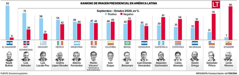 Son solo cuatro los países de la región con líderes de gobierno que entre septiembre y octubre promediaron un apoyo ciudadano de 50% o más: El Salvador, República Dominicana, Uruguay y México. En cambio, son seis los mandatarios que tienen el mismo porcentaje o más de imagen negativa, con Lenín Moreno, de Ecuador (90%), y Sebastián Piñera (70%) liderando el peor índice, según el estudio divulgado por la organización independiente Directorio Legislativo, con sede en Buenos Aires y Washington.