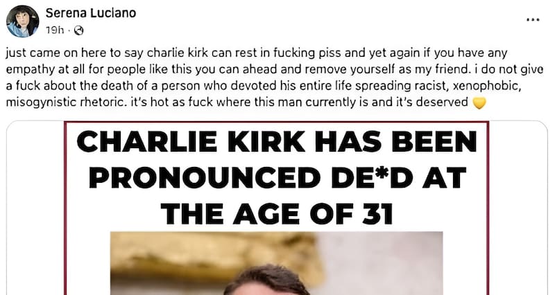 “Solo paso por acá para decir que Charlie Kirk puede descansar en pis (sic)... Me importa una mierda la muerte de una persona que dedicó toda su vida a difundir retórica racista, xenófoba y misógina. El lugar en el que este hombre está ahora es caliente como la mierda, y se lo tiene merecido”.