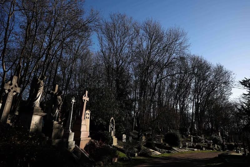 El cementerio de Highgate, de la época victoriana, repleto de tumbas cubiertas de hiedra y monumentos de piedra ornamentados, se extiende a lo largo de 15 hectáreas del norte de Londres y es una atracción popular, especialmente para los visitantes de izquierda que desean presentar sus respetos en la tumba de Marx.