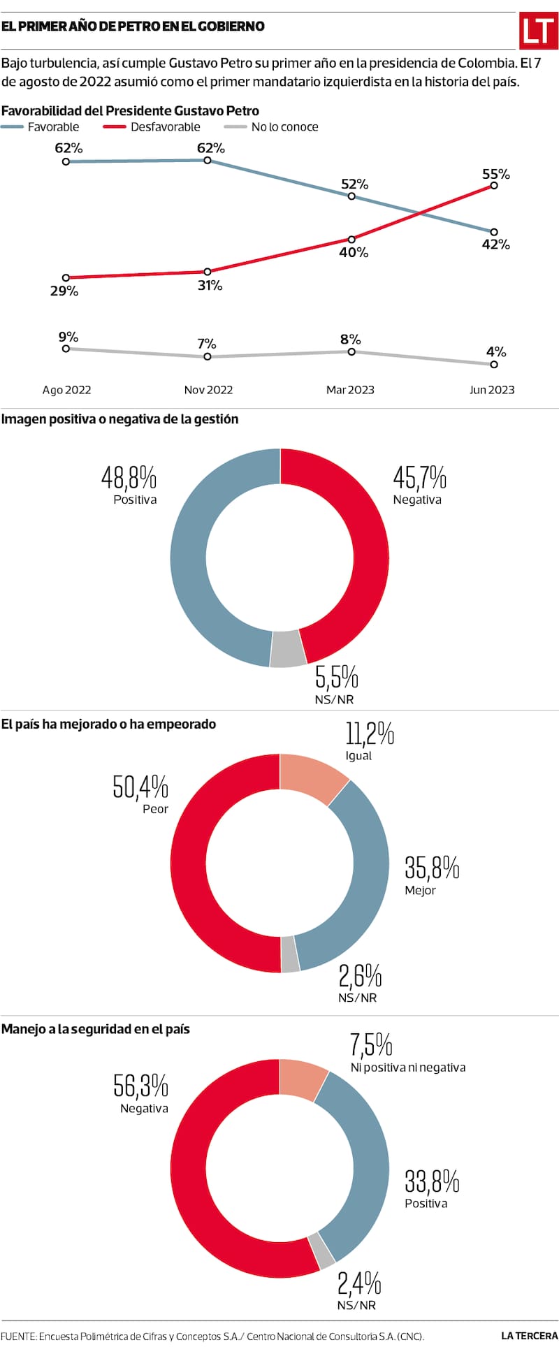 Las turbulencias del gobierno, sin embargo, no han llegado a reflejarse en la economía del país, destaca France 24. Durante el primer año de Petro, el dólar ha llegado a su precio más bajo en meses; el déficit fiscal se mantiene estable y se proyecta una reducción de un punto porcentual respecto al 2022 para llegar al 4,3% del PIB; la inversión extranjera alcanzó los 12.169 millones de dólares, significativamente más que en el primer año de gobierno de Iván Duque, el predecesor conservador de Petro.