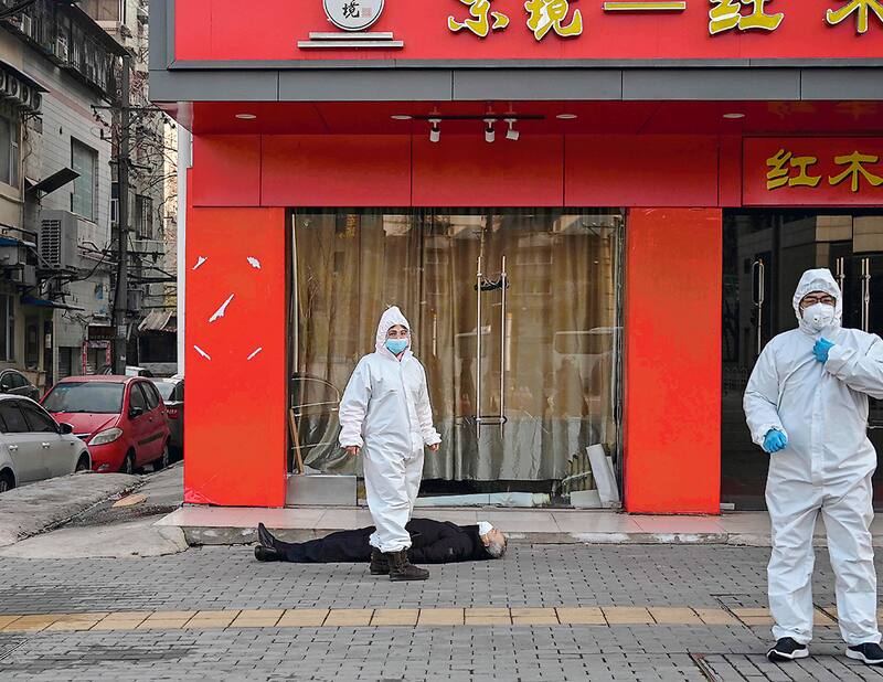 30 de enero. Funcionarios con trajes de protección observan a un anciano que se desmayó y murió en la calle, cerca de un hospital de Wuhan, donde se originó el virus. Ese día, la Organización Mundial de la Salud declaró que el brote era una “emergencia de salud pública de importancia internacional”.