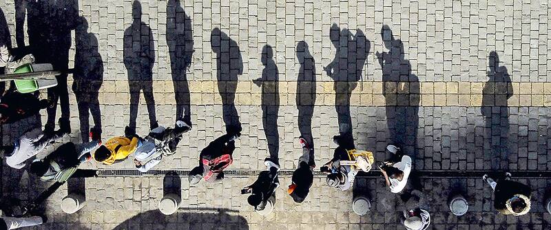 24 de julio. Vista aérea de un grupo de personas que hace fila para ingresar a una sucursal de una AFP en Santiago para obtener información sobre el primer retiro del 10% de sus fondos, una medida aprobada en julio por el Congreso para ayudar a mitigar los efectos de la crisis derivada del coronavirus.