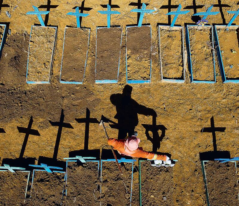 2 de junio. Un sepulturero de pie en el cementerio de Nossa Senhora Aparecida, donde las víctimas de Covid-19 fueron enterradas, en el barrio de Taruma, en Manaos. Con más de siete millones de casos y 180 mil muertes, Brasil es actualmente el tercer país más afectado por la pandemia.