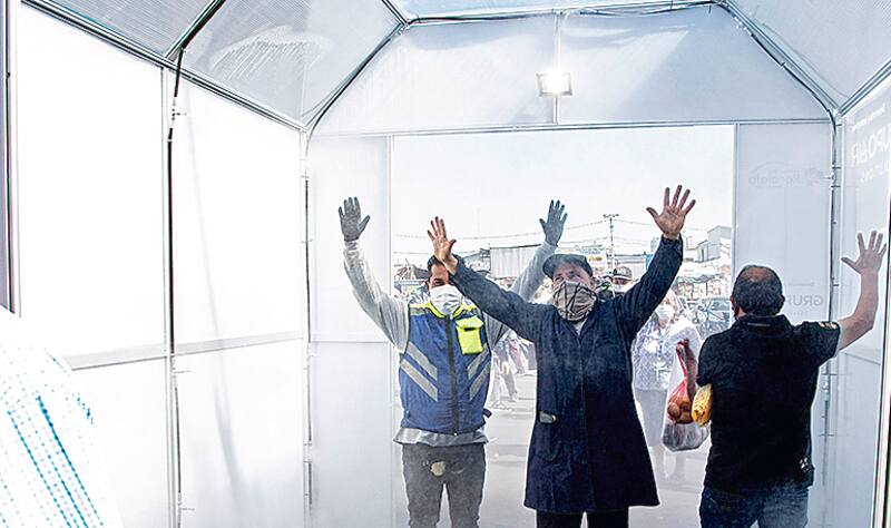 7 de abril. Ciudadanos pasan por un túnel de limpieza y desinfección denominado “Túnel de la Vida”, que a través de agua electrolizada ayuda a higienizar a las personas que ingresan al Mercado Central de Santiago. Esta fue una de las medidas tomadas por las autoridades en preparación para Semana Santa, en abril pasado.