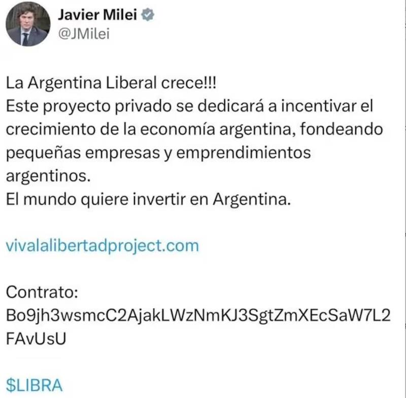Todo comenzó cuando Milei publicó en su cuenta de X -en la que tiene más de 3.800.000 seguidores- una recomendación para invertir en “Viva la Libertad Project”, con la cripto $LIBRA -de la empresa KIP Network-, ya que iba a estimular la economía y ayudar a las pequeñas empresas que crezcan.