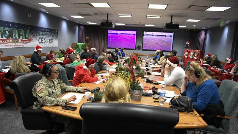 El NORAD espera que este año unos 1.100 voluntarios ayuden a responder a las llamadas en un centro de operaciones de la Base Espacial Peterson, en Colorado Springs, desde personal de mando hasta personas de todo el mundo.