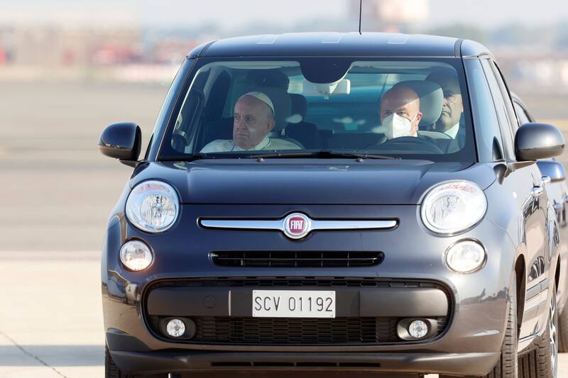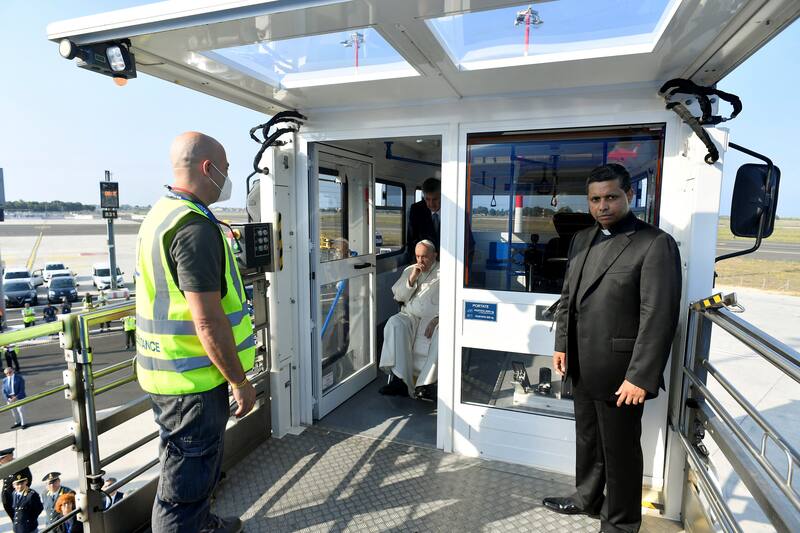 Francisco, en silla de ruedas, salió por la parte trasera de su avión con la ayuda de un elevador móvil antes de ser conducido en un Fiat blanco compacto a un hangar del aeropuerto donde fue recibido por Trudeau, Simon y otros dignatarios.
