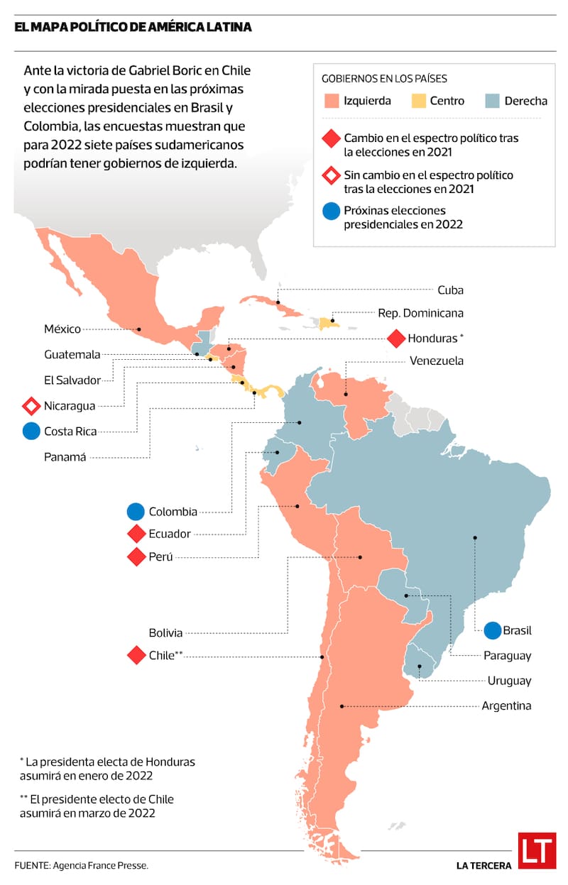 Hace 10 años, la región vio la cúspide de la llamada marea rosa o pink tide, cuando todo el mapa latinoamericano estaba teñido por gobiernos progresistas, con la excepción en ese momento de México, Honduras, Panamá, Colombia y Chile. Tras años de declive y después de una serie de estallidos sociales durante sus administraciones, la izquierda perdió terreno. Sin embargo, el triunfo de Boric se suma a la reciente llegada al poder de Alberto Fernández en Argentina (2019), Luis Arce en Bolivia (2020) Pedro Castillo en Perú (2021).