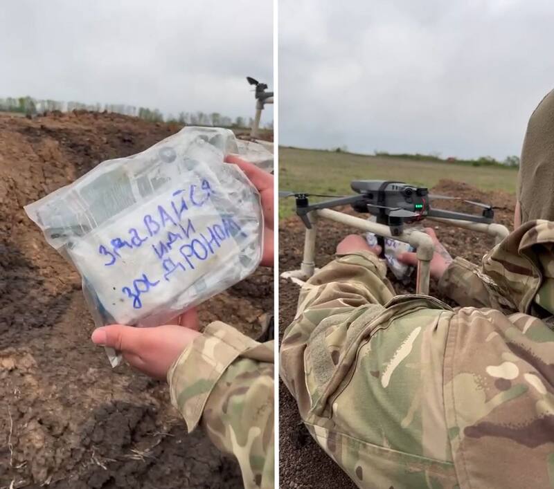 Los oficiales ucranianos en el puesto de mando le dijeron a Boxer que se pusiera en contacto. Sacó un marcador Sharpie de su botiquín y escribió en ruso en el empaque de sus raciones de comida: “Ríndete, sigue al dron”. Rellenó el embalaje con tierra para el peso.