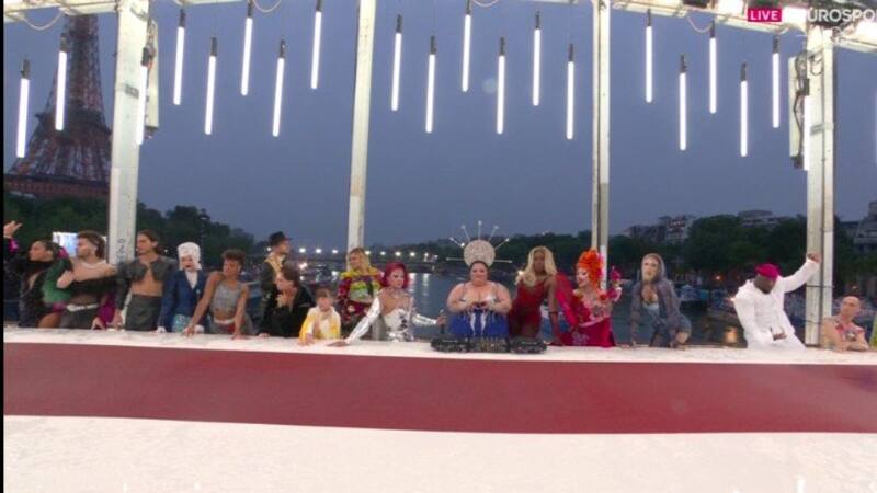 El segmento de la ceremonia del 26 de julio se asemejaba a la escena bíblica de Jesucristo y sus apóstoles compartiendo una última cena antes de la crucifixión, pero presentaba drag queens, una modelo transexual y un cantante desnudo como el dios griego del vino Dioniso.