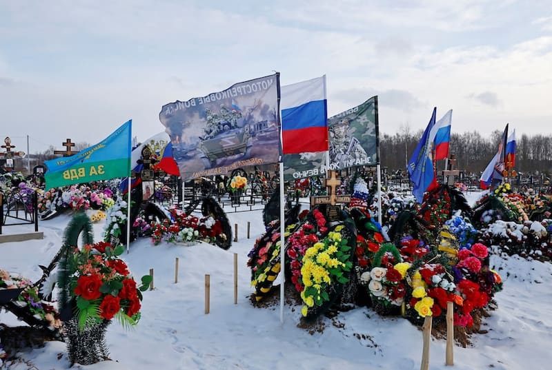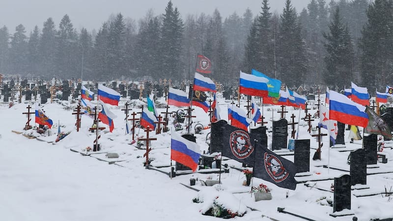 En un cementerio nevado cercano, las banderas del grupo mercenario Wagner y de las unidades de convictos Storm-Z ondean sobre tumbas recientes.