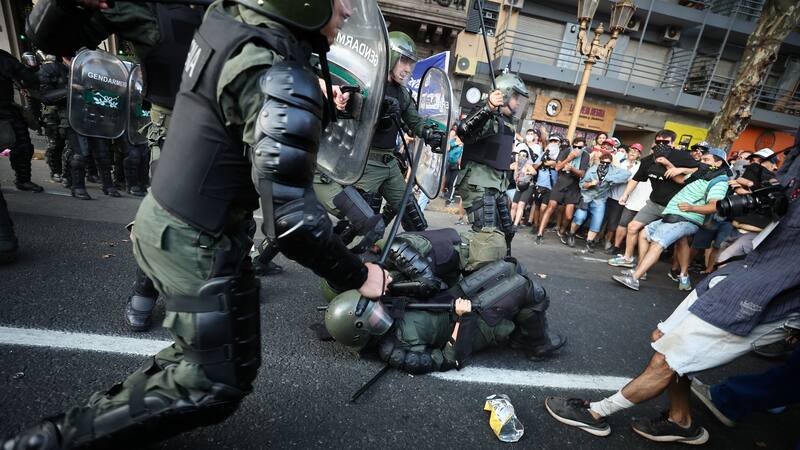 En los enfrentamientos entre los manifestantes y la policía se repitieron las escenas de la jornada de protestas del miércoles, con detenidos y heridos, lo que provocó que algunos diputados kirchneristas salieran de recinto y, al observar la gravedad de la situación, pidieran suspender la sesión, lo que fue rechazado.