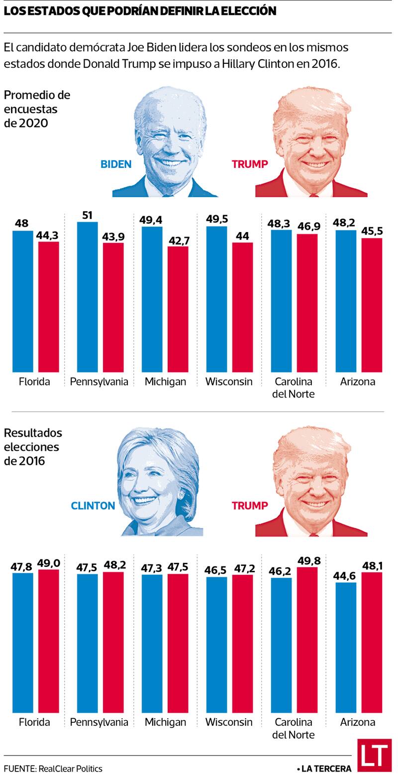 Si bien se estima que habrá unos 15 “estados bisagras” en las elecciones del 3 de noviembre, la disputa por el sillón de la Casa Blanca podría ser definida por seis “campos de batalla”. Según el sitio RealClearPolitics, la elección dependerá de lo que ocurra en Pennsylvania, Michigan, Wisconsin, Carolina del Norte, Arizona y Florida.fe