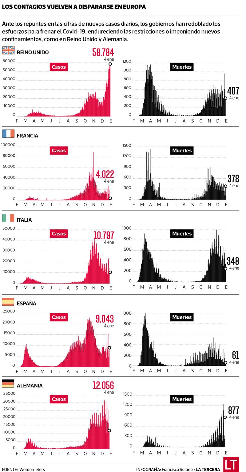 Tal como advirtieron los expertos en diciembre, las cifras epidemiológicas de Europa revelan por estos días un alza sostenida de contagios de Covid-19 tras las fiestas de fin de año. Así, los preocupantes datos han elevado las alertas respecto a un inminente nuevo confinamiento, igual de duro respecto del comienzo de la pandemia.