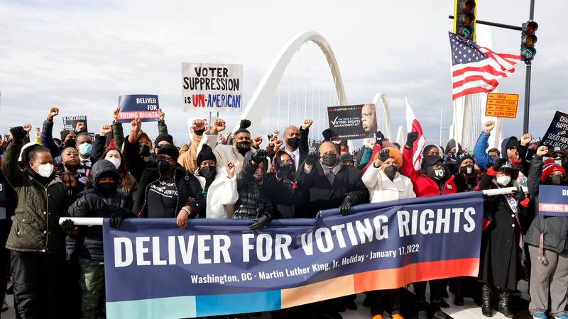 Los manifestantes en la Caminata por la Paz del lunes se hicieron eco de las demandas hechas por MLK hace más de 60 años mientras coreaban: “¿Qué queremos? ¡Derecho al voto! ¿Cuándo lo queremos? ¡Ahora!”.