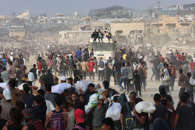 Aquí es cuando digo que es un experimento sádico. Porque les disparan. No hay razón para que hagan eso. Porque claramente (los que van a buscar ayuda humanitaria) están desarmados. No representan una amenaza. Además, los ponen en jaulas para que corran, para conseguir comida limitada. Así que están transformando a los palestinos de Gaza en animales. Porque cuando nuestro cuerpo se muere de hambre, la capacidad más básica de respetarnos a nosotros mismos como humanos y a los demás desaparece, se evapora. Reitero, están transformando a la gente de Gaza en animales. Es increíble. Los científicos dicen que cientos de miles, no decenas de miles, han perecido. Y ni siquiera contamos cuántos son asesinados por la supuesta fundación humanitaria. ¿Han visto alguna vez una distribución de ayuda humanitaria reforzada con fuego?