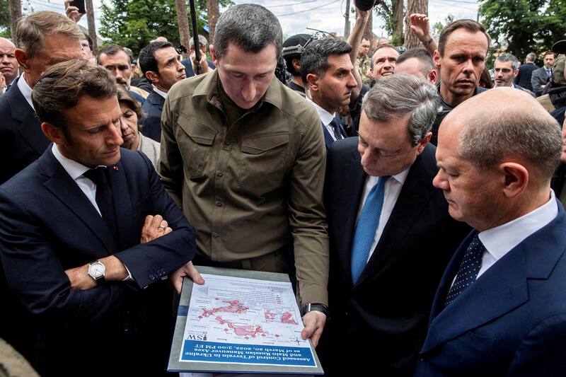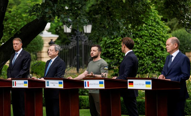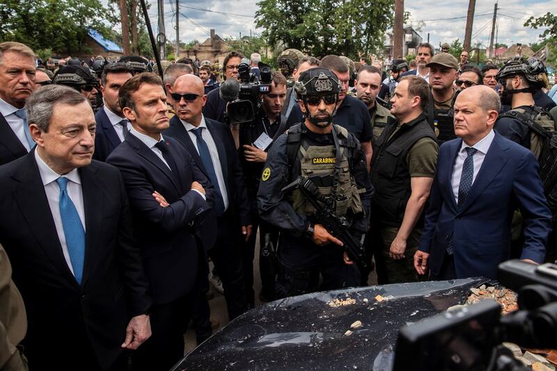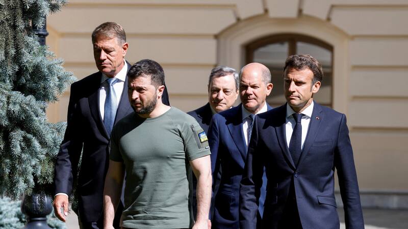 El Presidente francés, Emmanuel Macron; el canciller alemán, Olaf Scholz, y el primer ministro italiano, Mario Draghi, viajaron juntos a Kiev en tren en un momento en que Kiev ha estado pidiendo más apoyo militar occidental para contrarrestar los bombardeos de artillería de Moscú. El Presidente rumano, Klaus Iohannis, se unió más tarde al grupo en una reunión con Zelensky y en una conferencia de prensa en la que Macron anunció que los cuatro líderes europeos respaldaban que Ucrania se convirtiera en miembro de la UE.