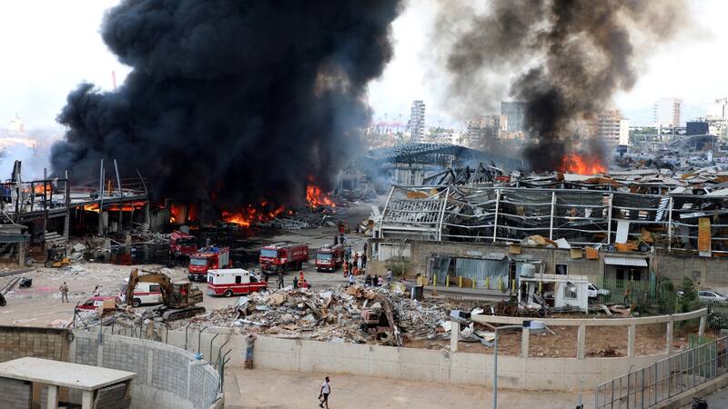 Imágenes de televisión mostraron a los bomberos tratando de apagar el incendio en un área rodeada por los restos destrozados de los almacenes que fueron destruidos por la explosión el mes pasado.