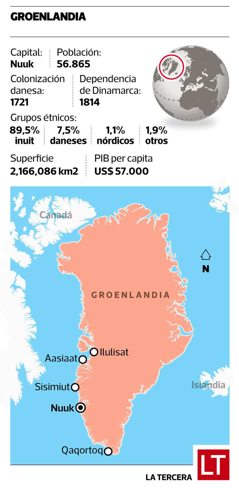 Habitada mayoritariamente por población inuit, Groenlandia es una enorme isla entre América del Norte y Europa, con 2.100 millones de kilómetros cuadrados: en comparación, un poco más grande que México, casi cuatro quintos que Argentina. Las poblaciones que habitan desde hace siglos el lugar se han centrado principalmente en la pesca y la caza.