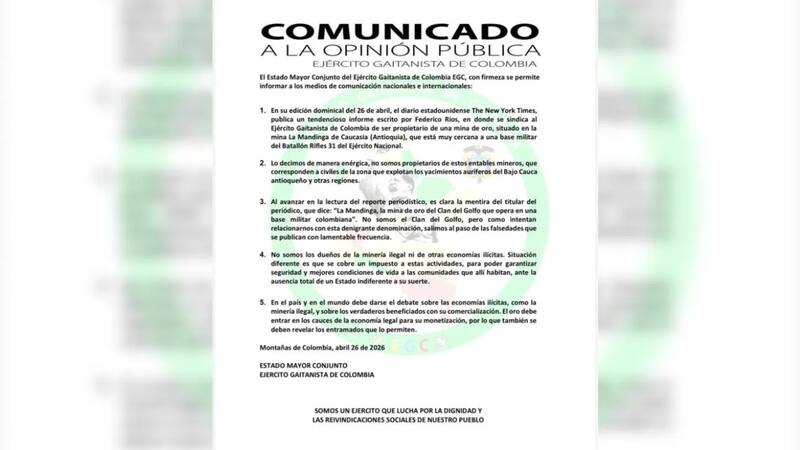 “En su edición dominical del 26 de abril, el diario estadounidense The New York Times publica un tendencioso informe escrito por Federico Ríos, en donde se sindica al Ejército Gaitanista de Colombia de ser propietario de una mina de oro”, señaló la organización paramilitar en el documento.