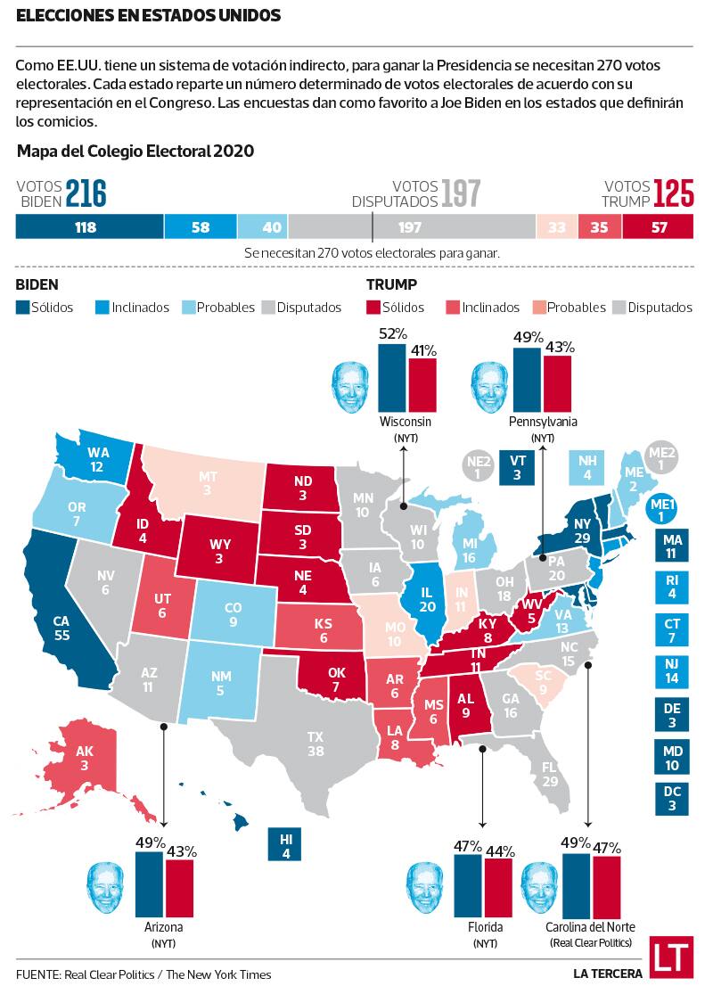 Para Donald Trump es especialmente crítica la situación en seis estados donde ganó en 2016 y donde Biden podría superarlo según los sondeos: Florida, Pennsylvania, Arizona, Wisconsin, Carolina del Norte y Ohio. Sin contar los estados disputados, Biden partirá las elecciones con 216 votos electorales “asegurados”, gracias a estados demócratas como California y Nueva York, mientras que Trump tiene una sólida base de 125 votos electorales gracias al respaldo de bastiones republicanos como Alabama, Tennessee y Oklahoma. Así, hay 197 votos en disputa de un total de 538 de acuerdo con Real Clear Politics.