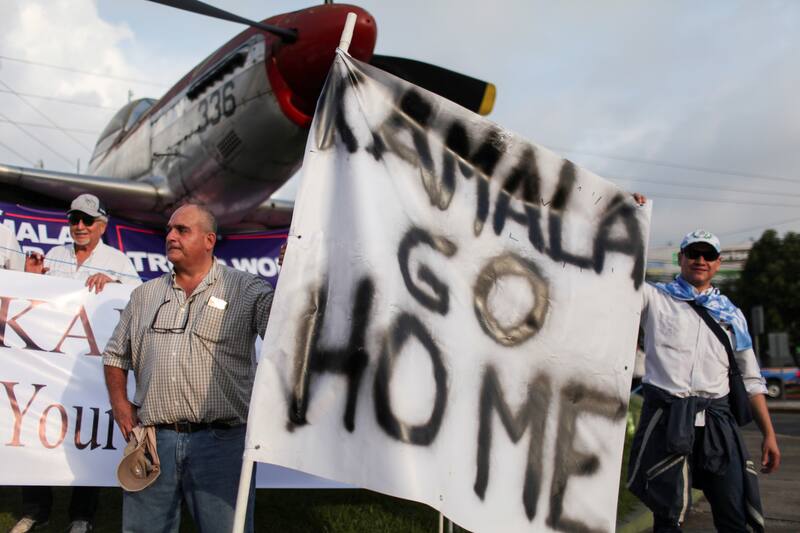 Un pequeño grupo de manifestantes guatemaltecos, vinculados a sectores de derecha y militares retirados, simpatizantes del expresidente Trump, rechazó la llegada de Harris fuera de la FAG al acusarla de “marxista” y de querer manipular al país con sus “políticas de izquierda”.