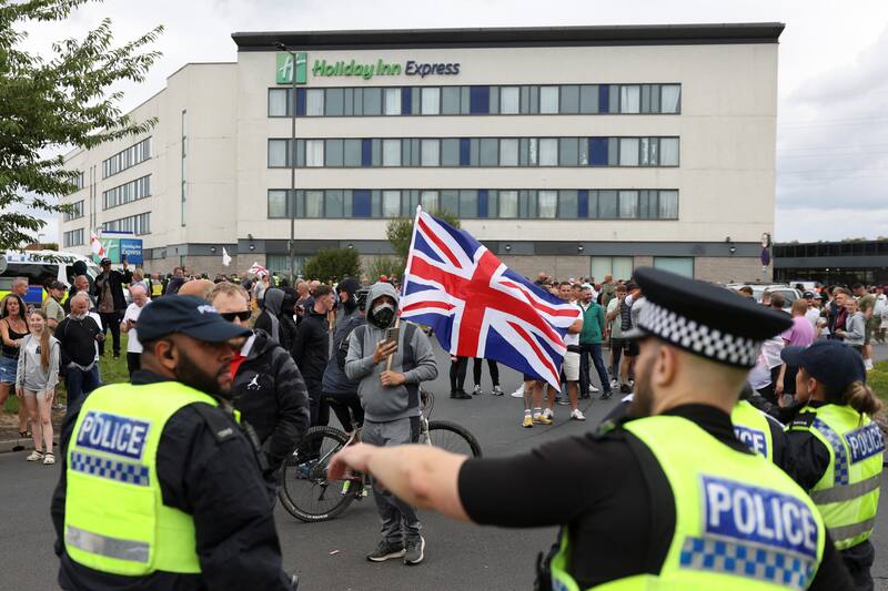 La policía local también instó a los ciudadanos a evitar la zona que rodea un hotel en Tamworth, en el centro de Inglaterra, y señaló que “un gran grupo de personas se encuentra en la zona y ha estado lanzando proyectiles, rompiendo ventanas, provocando incendios y atacando a la policía. Un agente ha resultado herido”.