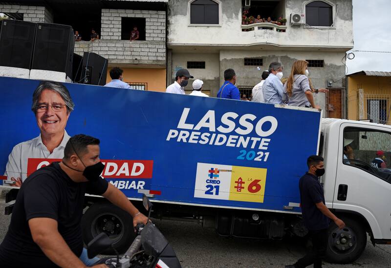 Más atrás y como principal competidor del correísmo se ubica Guillermo Lasso, un exbanquero de 65 años y líder del Movimiento CREO, que compite por tercera vez por el sillón presidencial en Ecuador. Lasso marca entre un 20% y un 26% de respaldo electoral en las últimas encuestas.