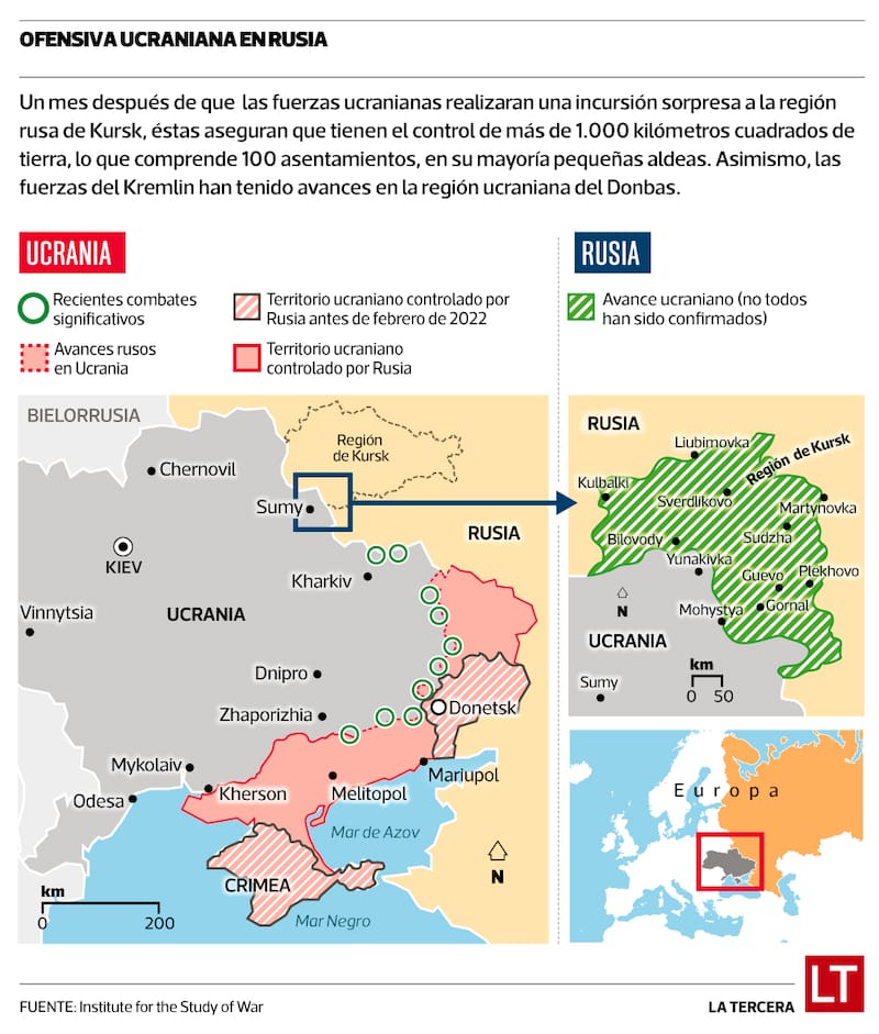 “La ofensiva de Kursk tiene una racionalidad política, no militar. Su propósito es ser una moneda de cambio. Ahora bien, cabe preguntarse de por qué se concibió así, ya que no parece haber indicios de que Putin estuviera en algún momento seriamente dispuesto a negociar. Pero no sabemos mucho sobre los esfuerzos negociadores realizados entre cuerdas. Si los ucranianos tienen la sensación de que Estados Unidos trataría de llevar a Ucrania a un alto el fuego adverso, la operación de Kursk tiene mucho sentido para aumentar la influencia diplomática de Kiev”, explicó a La Tercera, Gustav Gressel, analista del centro de estudios European Council for Foreign Relations.