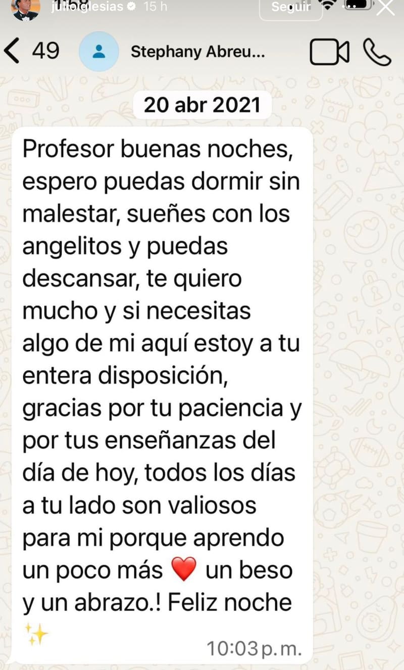 En uno de los mensajes, de septiembre de 2021, se puede leer: “Hola profesor, buenas tardes, me avisas cuando quieras que vaya para hacer los ejercicios”, en un pantallazo que da cuenta del que sería el nombre de una de las denunciantes. La misma le habría escrito: “Feliz, feliz cumpleaños Julito!!! Querido profesor, que Dios te siga llenando de mucha salud para que puedas seguir gozando de esta hermosa vida, te mando un beso y un abrazo. TE QUIERO. Siempre te recuerdo con cariño. Atte. tu fisioterapeuta para siempre”.