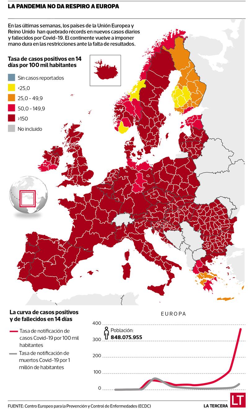 El actual escenario de la pandemia no parece prometedor en el Viejo Continente. El Centro Europeo para la Prevención y el Control de las Enfermedades (ECDC) señaló que la tasa de notificación de casos en los últimos 14 días, según datos oficiales de 31 países, es de 602 por 100 mil habitantes, con un alza constante de los índices durante 112 días. Solo ocho países informaron esta semana una estabilización o una disminución de la situación epidemiológica, lo que obligó al continente a imponer nuevas restricciones de movimiento.