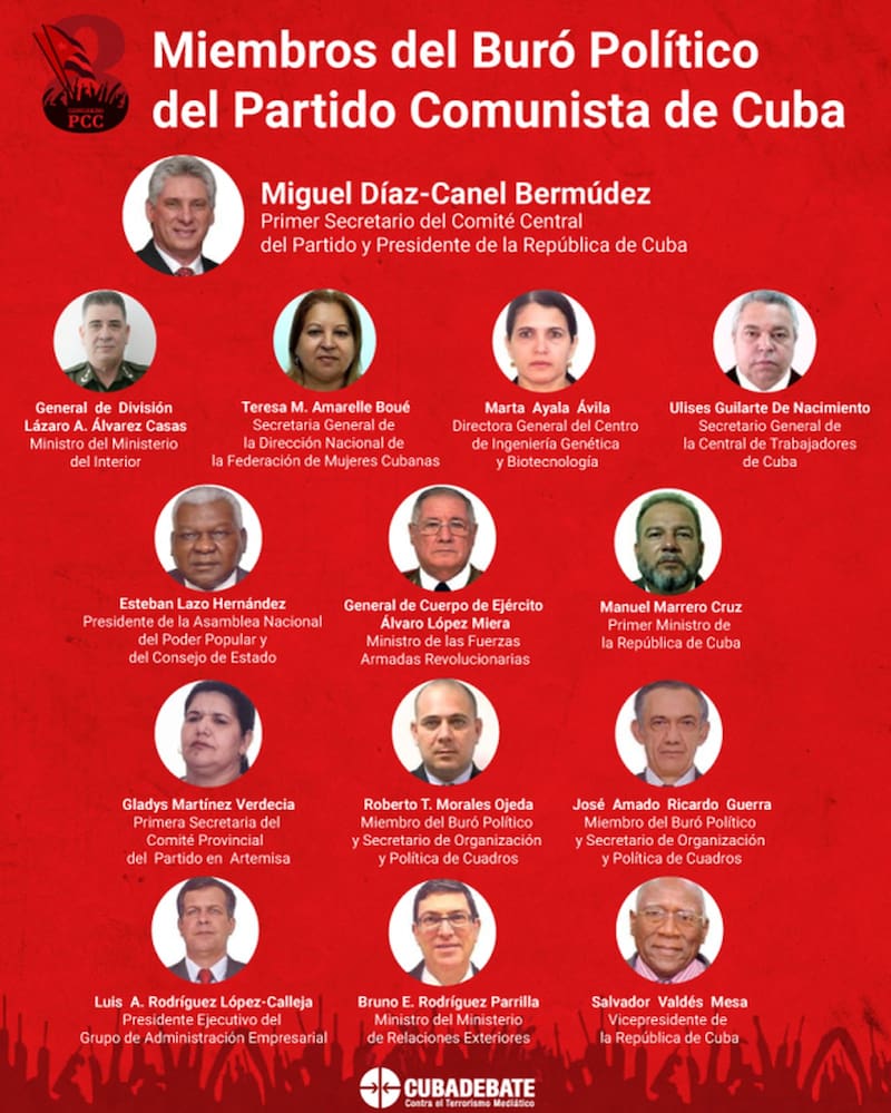 Este órgano superior del Comité Central, que quedó reducido de 17 a 14 miembros, representa el corazón político de la isla y está encabezado por Miguel Díaz-Canel (60), presidente de la República y ahora primer secretario, en lugar de Castro.