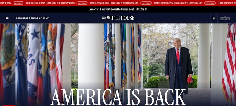 Inmediatamente, al culminar la agitada jornada en Washington, el sitio web de la Casa Blanca comenzó a mostrar un reloj que marca la duración del cierre del gobierno en la parte superior del home. Las palabras junto al reloj dejan claro a quién culpa la Casa Blanca por el fallo en el financiamiento del gobierno: “Los demócratas han cerrado el gobierno”.